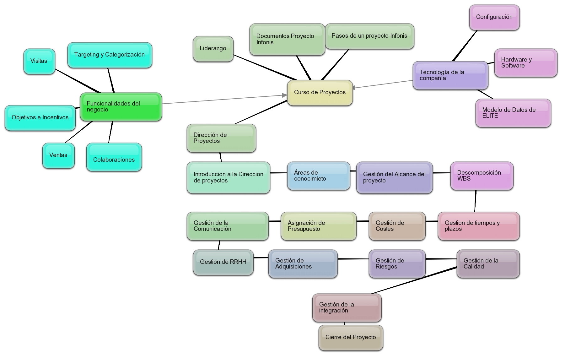 Inicialmente he pensado en 3 grandes áreas de formación debido a que somos una empresa de desarrollo de software, CRM y B.I. principalmente en un modelos SaaS (así lo llaman ahora que llevamos 15 años haciéndolo) y con dispositivos móviles tendré que cubrir tanto la técnica de gestión de proyectos como aspectos del negocio de nuestros clientes (tenemos un segmento muy vertical en CRM) como de tecnología involucrada en la solución.