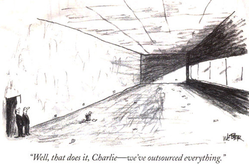 Encontraba el otro día a través de tic616, esta viñeta que describe muy bien lo que vamos a acabar siendo. La verdad es que no estoy en contra del outsourcing o externalización, de hecho es lo que vendo. Pero claro luego está lo que yo externalizo ¿Debo externalizar? ¿Puedo? Aquí  también me he mantenido desde hace tiempo entre los que promulgaban centrarse en lo que realmente hacemos bien y aportamos valor, cediendo a otros aquello que no, pero claro si te dedicas a tecnología la línea es muy difusa. Debo dado que vendo software y mantengo servidores con mi software mantener y administrar mi propio correo ¿O lo externalizo? Debo mantener mis bases de datos o lo cedo. De hecho debo «desarrollar» mi base de datos o uso una de terceros? ( 😉 ) Esto último seguro que todos tienen una respuesta inmediata y en realidad no hace mucho fue un fuerte debate interno y está volviendo a serlo en los nuevos entornos móviles.